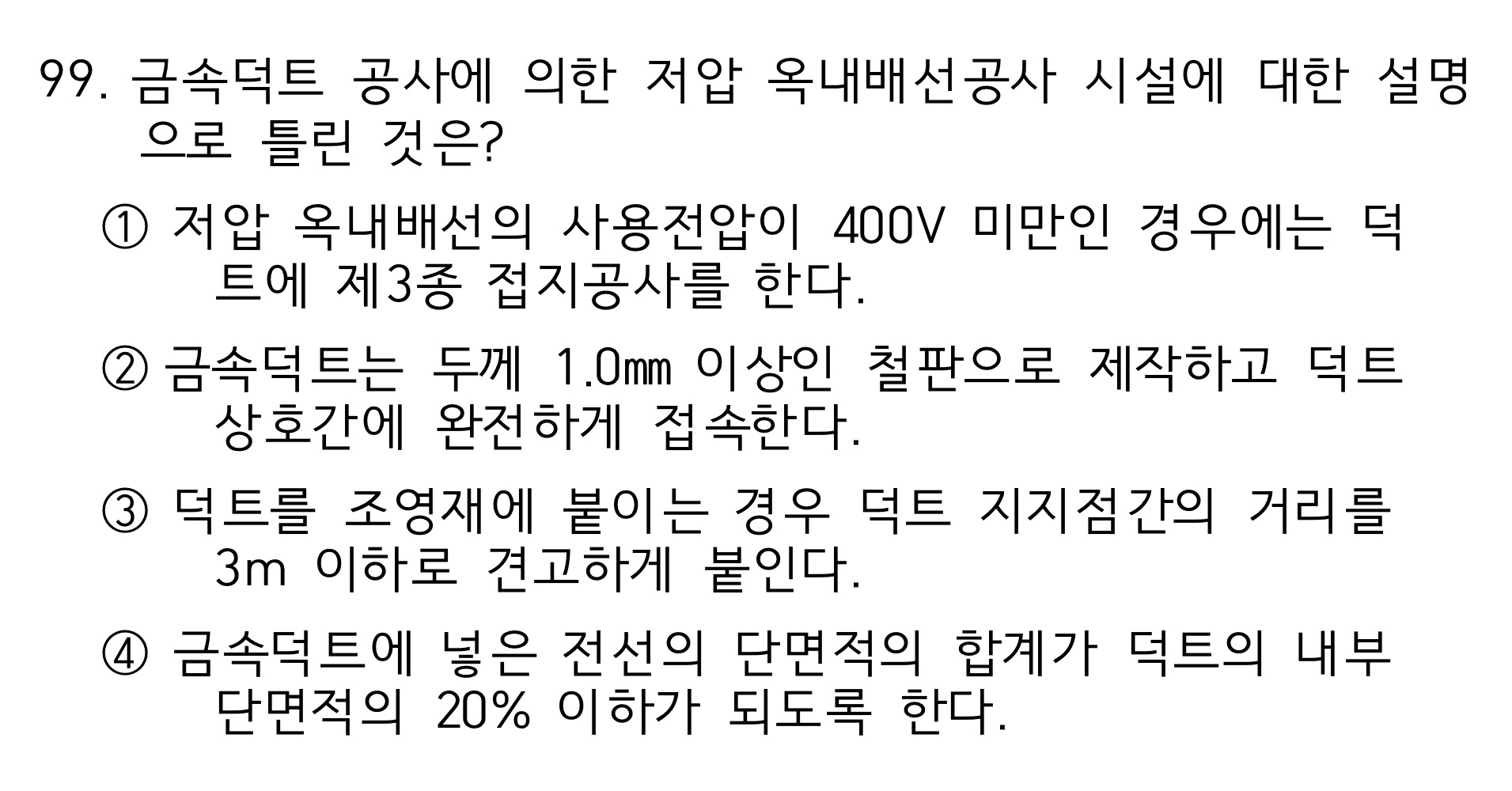 1. 금속덕트에 넣은 전선의 단면적의 합계는 덕트 내부의 단면적의 20%이하여야한다