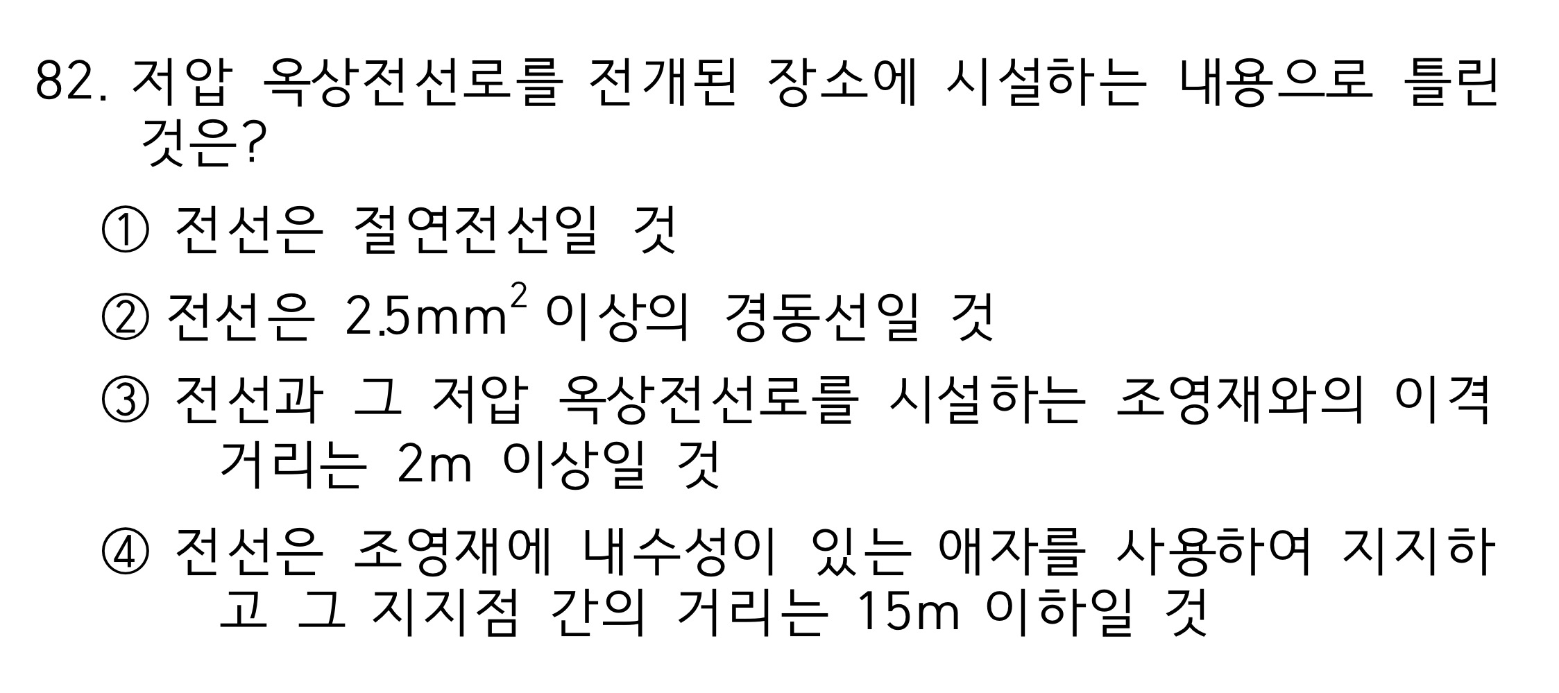 1번은 노출하면 안되고 3번은 2.5mm이상이고 4번은 애자사용공사는 사항에 없죠